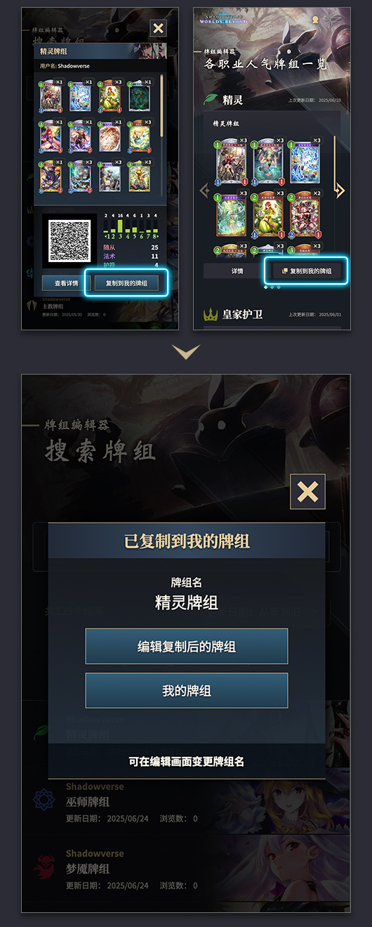 在搜索牌组、人气牌组以及公开牌组一览中点击牌组下方的“复制到我的牌组”按钮,便可将牌组复制为自己的牌组。