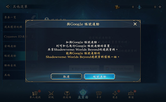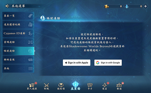 請在欲進行連動的裝置中安裝《Shadowverse: Worlds Beyond》後,於遊戲標題畫面的「資料連動」內,選擇所設定的外部服務進行連動。