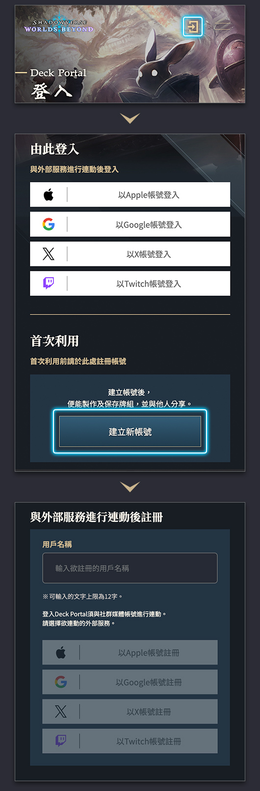 若尚未建立帳號,請經由「登入」前往註冊帳號頁面進行相關手續。在確認協議內容並輸入用戶名稱後,便可透過連動各種社群媒體來註冊帳號。 社群媒體帳號之間無法進行連動。