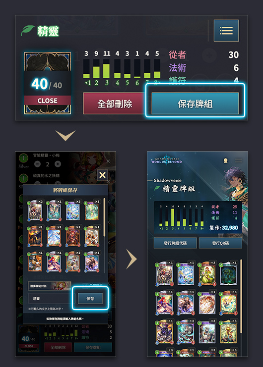 若牌組內編入的卡片為40張,便可「保存」牌組;若非40張,則可「暫時保存」牌組。