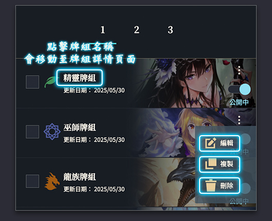 牌組將被保存至「我的牌組」,可在該頁面中進行編輯、刪除或複製牌組。