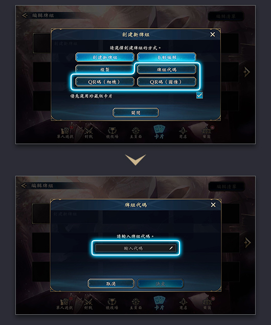 在遊戲中點擊「編輯牌組」後選擇「創建新牌組」按鈕,再透過「輸入牌組代碼」或「QR碼(相機)」讀取對應的代碼,便可導入牌組。