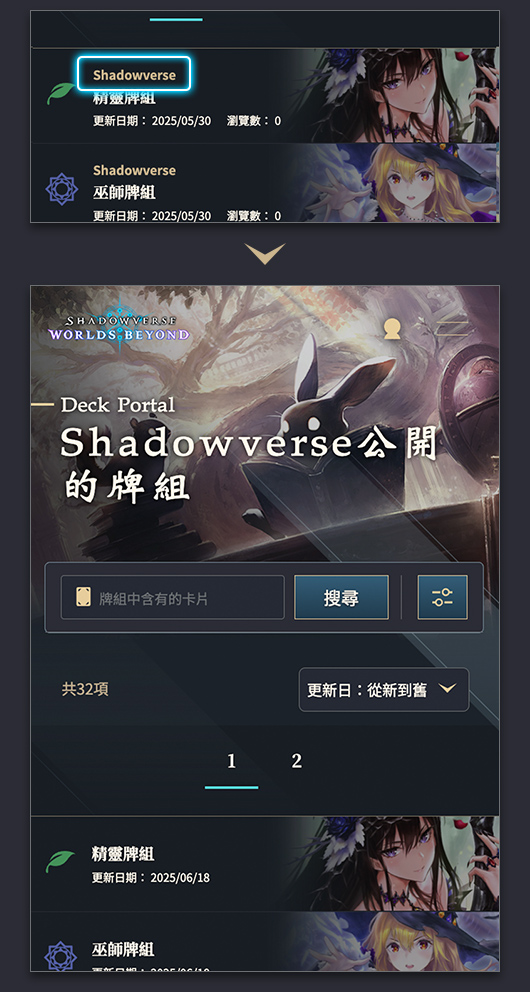 可透過職業或牌組中含有的卡片來搜尋牌組。