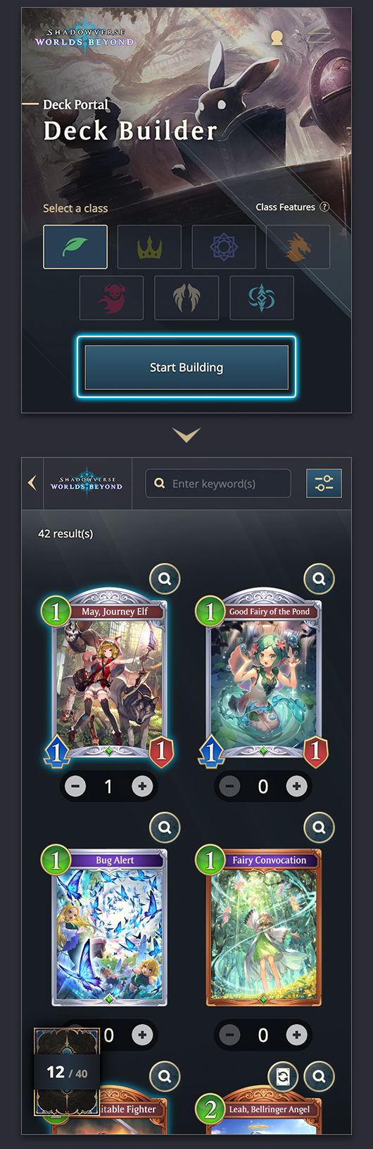 Click Start Building to open the Deck Builder screen. Tap Start Building to open the Deck Builder screen.