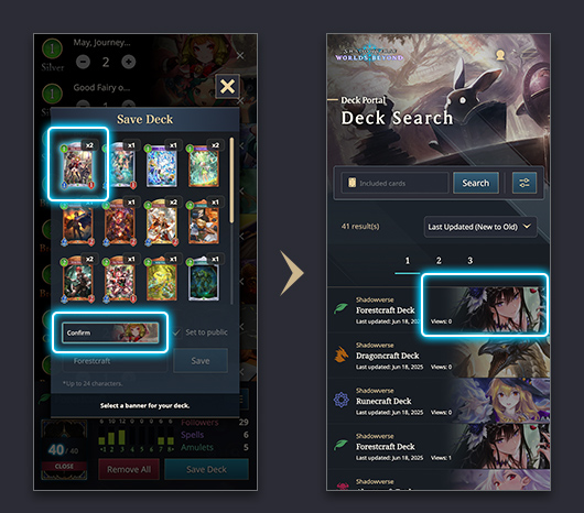 On the Deck Builder screen, you can build your 40-card deck or save a temporary deck of up to 50 cards for later.