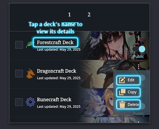 Saved decks will be accessible from the My Decks page. From here, you may edit, delete, copy, and toggle between "public" and "private" settings for each deck.