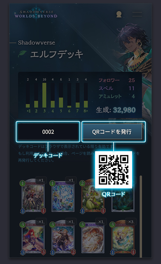 「デッキコードを発行」もしくは「QRコード」ボタンをクリックすると、それぞれのコードが発行されます。