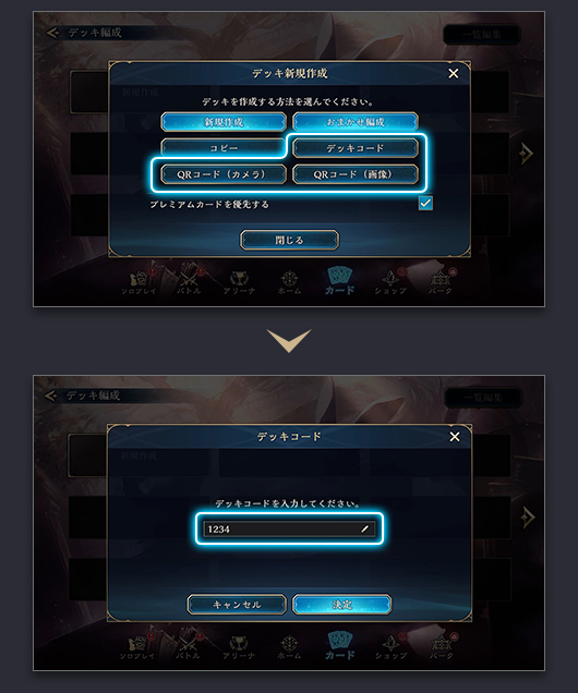 「デッキコード入力」、「QRコード(カメラ)」ボタンからそれぞれのコードを読み込むとデッキが読み込まれます。