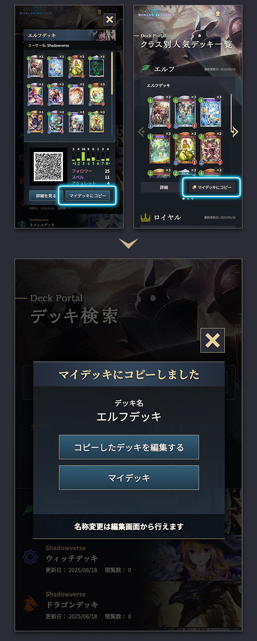 デッキ検索、人気デッキ一覧、公開デッキ一覧共に「マイデッキにコピー」ボタンをクリックすると、デッキを自分のマイデッキとしてコピーすることができます。