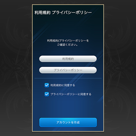 「シャドナビWB」インストール後、利用規約とプライバシーポリシーを確認し、「アカウント作成」をタップします。