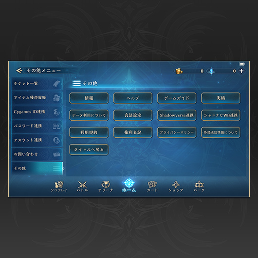 「Shadowverse: Worlds Beyond」 のホーム画面から、「その他メニュー」→「その他」とタップし、「シャドナビWB連携」をタップします。