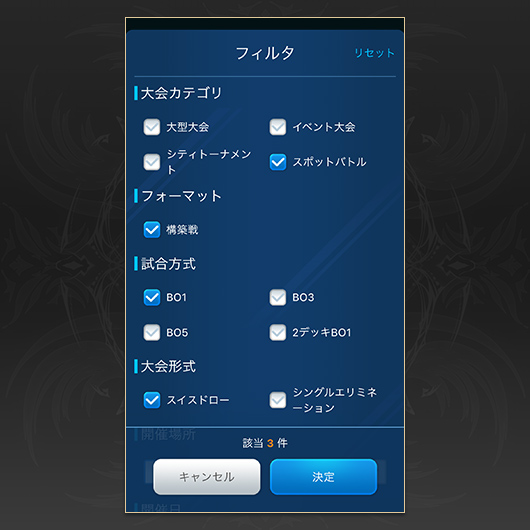 大会のカテゴリや開催場所で、フィルタでの検索ができます。