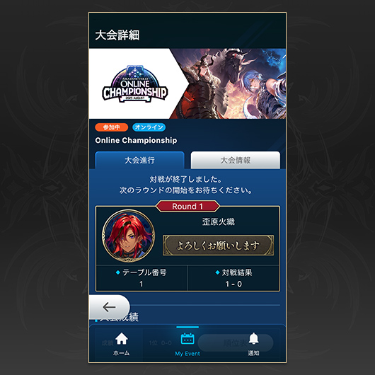 「大会進行」に対戦相手の名前や、テーブル番号などが表示されます。