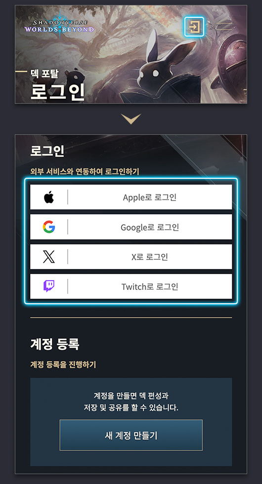 계정이 없는 경우 로그인 화면에서 새 계정 만들기 화면으로 이동하여 약관 확인 및 닉네임 입력 후 외부 서비스와 연동하여 계정을 등록할 수 있습니다. 외부 서비스 계정 간의 연동은 할 수 없습니다.