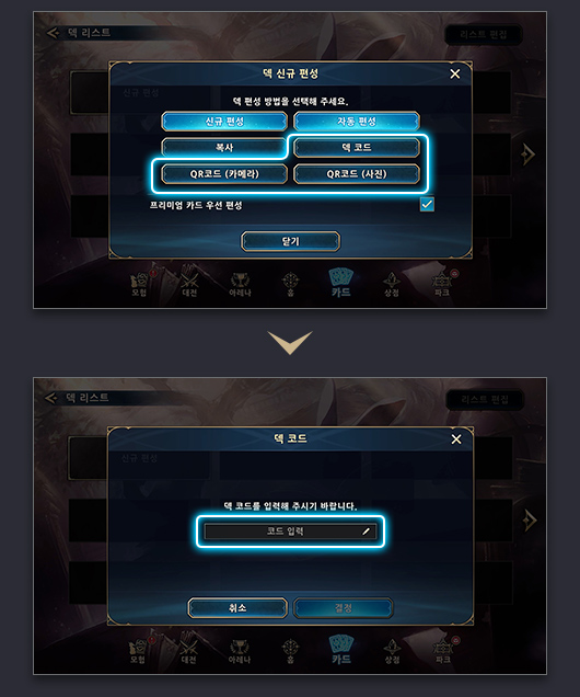 [덱 리스트]에서 [신규 편성] 버튼을 선택하고 [덱 코드 입력], [QR코드 (카메라)] 버튼으로 덱을 불러올 수 있습니다.