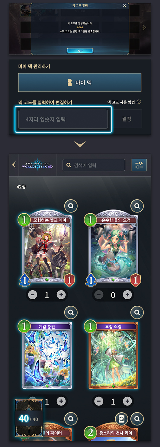게임에서 발행한 덱 코드를 입력하면 덱을 덱 포탈에 불러올 수 있습니다.